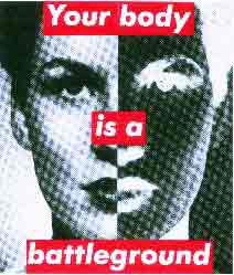 "How Dare You Not Be Me?" is inscribed on a sign over the entrance to a room of Barbara Kruger's one-woman exhibition at the Whitney Museum. The show is not subtle. The greeting slogan is the initial signal of Kruger's adeptness at capturing the essence of narcissistic consumer culture, a skill she honed when she began her working life in advertising. Thinking about the people I know with "How Dare You Not Be Me?" attitudes as I walk into the room, I realize that Kruger is thinking more globally. A plaque in the floor reads "My people are better that your people." Coming out of a loudspeaker, a man's voice booms, "Get down on your knees and pray to the Lord!" and then there is organ music and women screaming. Originally conceived as a gallery installation in 1994, the room is wallpapered with black and white images of crowd scenes. The portion of Kruger's work is more about the power of manipulated words than it is about visual imagery. Leaving the claustrophobic racism room, the sensory overload lessens. The next room is big and airy. In the center is my favorite part of the show, a huge white sculpture of a smiling Marilyn Monroe, cheerleader-like on the shoulders of two Kennedys in suits. It's called "Family," and was constructed in 1997 of painted fiberglass. Marilyn's wearing her ubiquitous short, pleated skirt, windblown as usual, but walking around the sculpture and looking closer reveals that she's wearing no underwear, and her anatomically correct private parts are clearly visible. The exhibit's not crowded, but many people are circling the exhibit smiling. The exploitation of sexy women by powerful, generic men is timely in the age of Bill Clinton. A similar sculpture looks like a couple in an embrace. Again, up close it proves to be something else. The figure that looks like a woman from a distance proves to be a man upon closer inspection. The rest of the room is more signature Barbara Kruger, black-and-white silkscreened photographs with slogans written in white Futura Bold Italic type on red rectangles. The slogans address women's perceived shortcomings, "Not Angry Enough," "Not Ugly Enough," "Not Sexy Enough," "Not Useless Enough." The women in the photographs range from glamorous models to Eleanor Roosevelt. Ten years earlier in Kruger's career, the work is less direct. In a small room with a parallelogram window, there are color photographs of the windows of stifling, nondescript stucco homes and apartments, seemingly in Florida or California, from the telltale palm trees. Along with the photographs, Kruger has included typewritten passages of desperate scenarios she has imagined occurring inside. One is about a woman who has just discovered she has breast cancer, while another concerns a man who suspects his wife is cheating on him. This work originally was published as a book. A series of color photographs from 1978 are called "Hospital" and refer to violence against women. The photographs capture the impersonality of a hospital. They depict a jar of tongue depressors, a curtain, and the brown leather corner of an examining table. They reflect the mundane reality experienced by someone being examined after a crime. The ordinary objects reek of anxiety. In Kruger's best work the color has disappeared from the photographs, and the text has become streamlined. This show's symbol image falls into this category. "It's a small world, but not if you have to clean it," uses a photograph of a 1950's housewife holding up a magnifying glass to her eye. Huge billboards of the image hung for the run of the show in New York City across the street from the Port Authority Bus Terminal and as a banner along the West Side Highway. The exhibit first opened at the Museum of Contemporary Art in Los Angeles. Despite the fact that some of this work hits you over the head with its message, I felt at home in this exhibit. Having helped to organize the 1989 March, it brought me back to the high of being swept up in a cause. Often feeling like an endangered species as a feminist in my day to day life, I could breathe easily here.