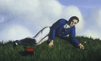 Similarly relying upon the expressive qualities of transcendent situations, Matthew Fisher depicts impossibly beautiful settings as a backdrop for the human saga to unfold. Fisher's 19 th century French soldiers live in a world of platonic ideals. Typically in Fisher's paintings, there exists a relationship with truth, beauty, life and death through a visual metaphor such as a strategically placed butterfly or a cascading train of flower petals. In September Sky , a lovelorn soldier lies on a hilltop clutching the stem of a flower whose petals he has plucked in a round of "she loves me she loves me not." His extreme concentration on the object of his desire materializes in the form of a cloud above him that resembles a Playboy playmate. The entire painting is saturated with the notion of romantic love, an obsession that is projected onto the landscape in a terrestrial narrative. War is the farthest thing from this contemplative soldier's mind. The same feeling of longing for a more sublime alternative to combat is evident in Reverse Migration , where a soldier rows his boat peacefully with a heron perched on the bow. The soldier avoids social and temporal classification despite his indicative military attire because he is used as a vehicle to explore the universal themes of loneliness and indifference--abstract concepts that span cultural boundaries and time.